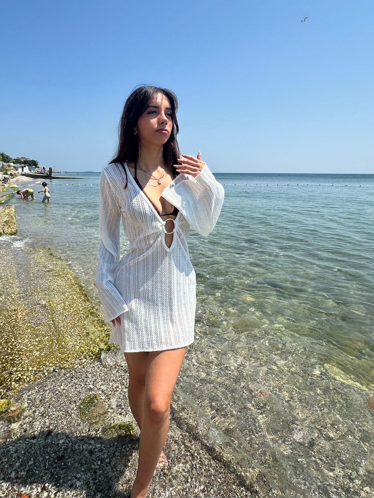 🤍 Beyaz Ajurlu Halka Detaylı Triko Pareo Elbise – Zarafetin Plaj Hali 🤍