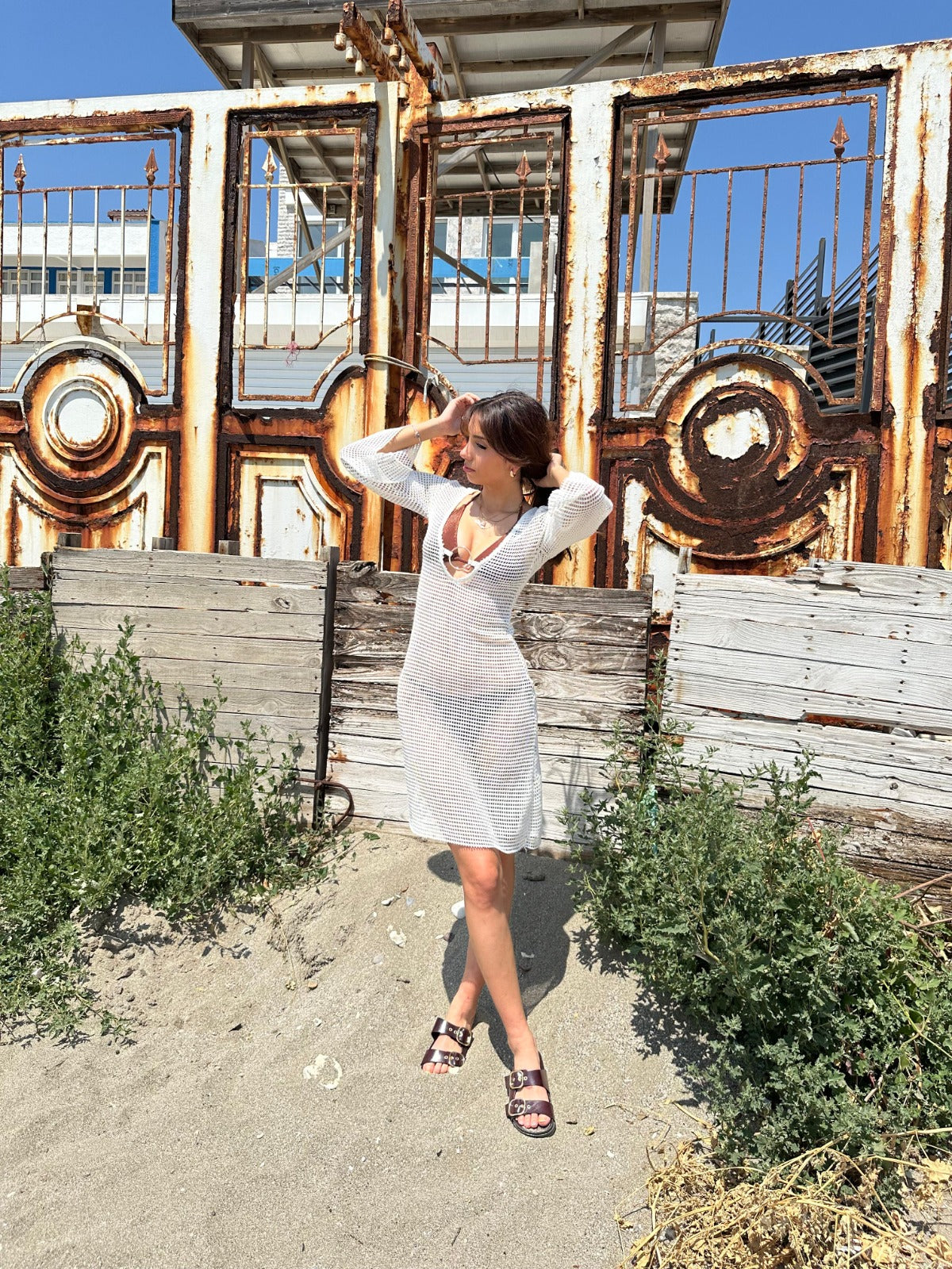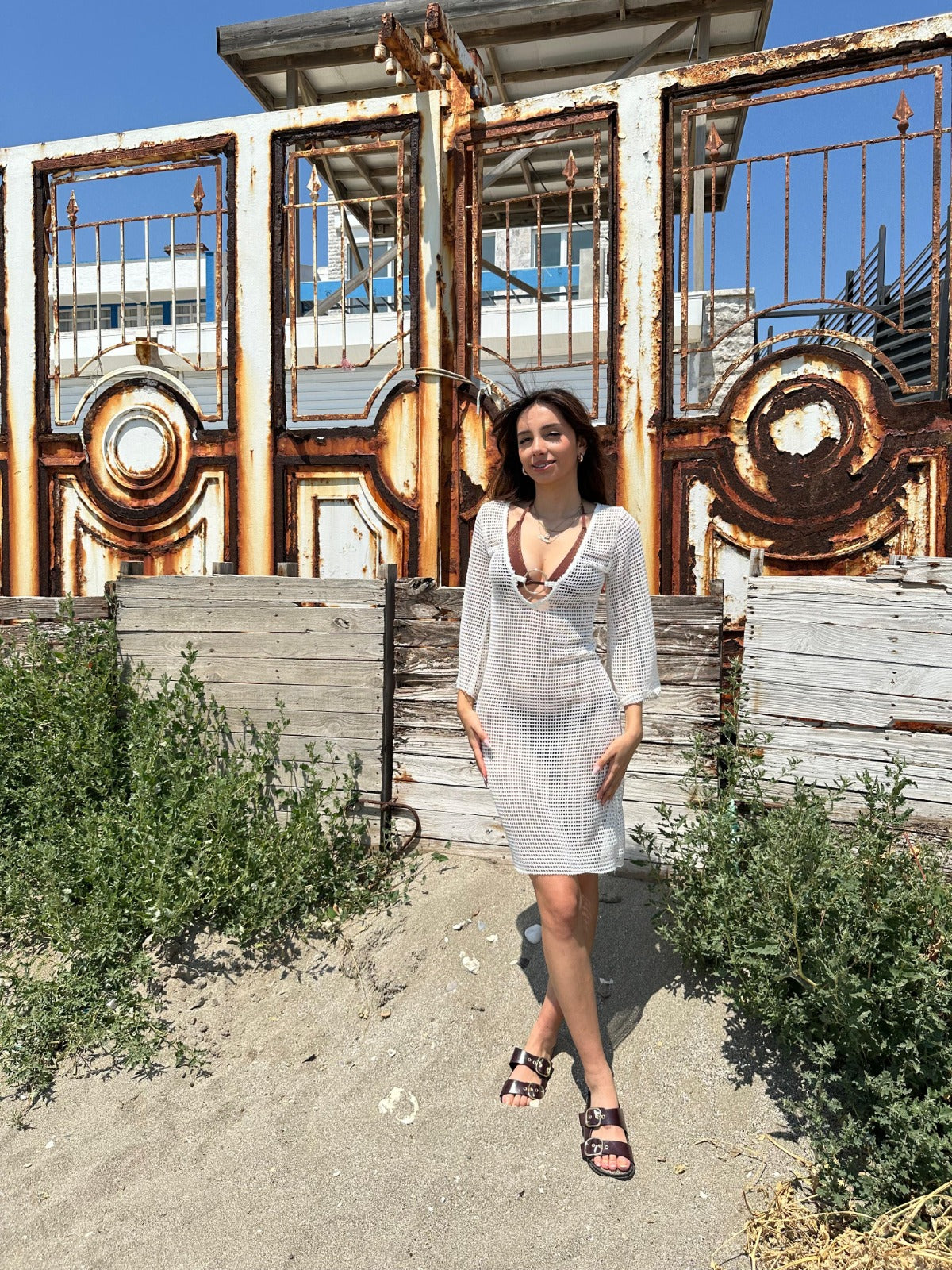 Şıklığı ve sadeliği bir araya getiren bu beyaz file triko plaj elbise, yaz stilinizi tamamlamak için tasarlandı. V yaka detayıyla feminen bir hava kazanan model, hafif file dokusuyla serinlik ve konfor sunar.