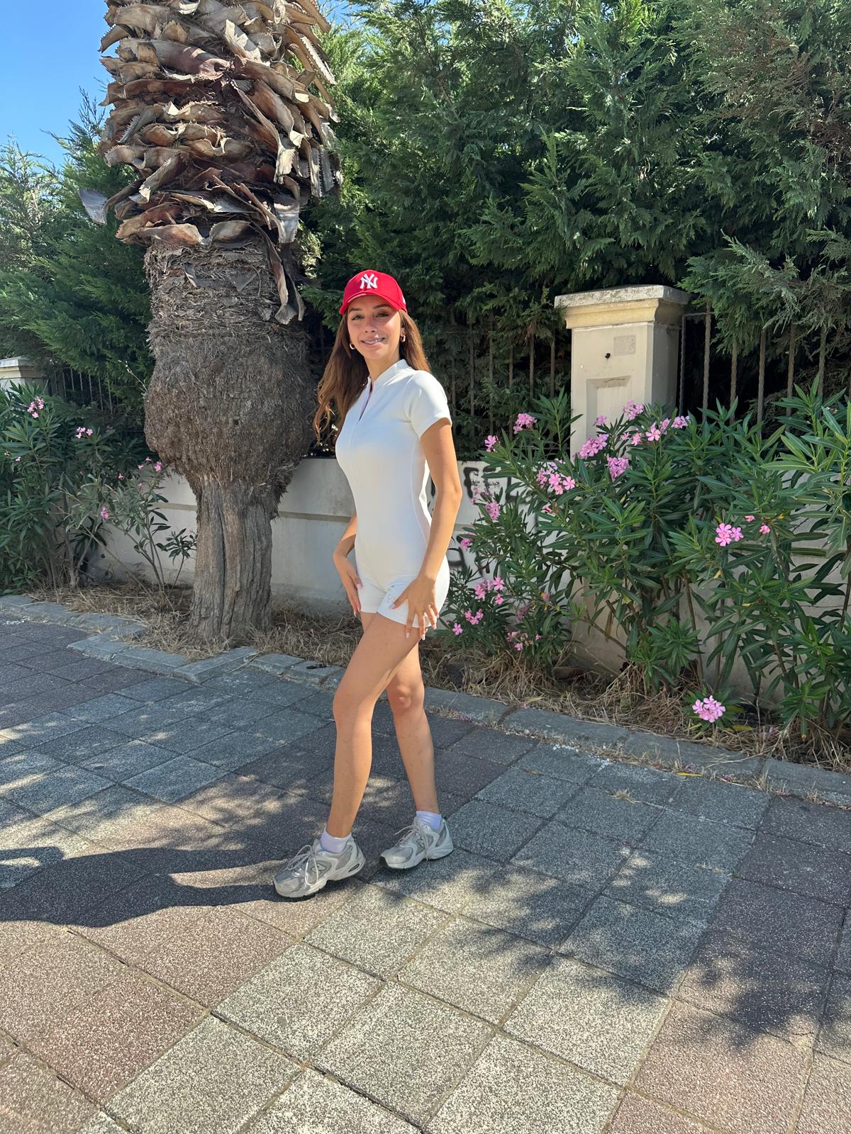 CherryLane Kadın Beyaz Scuba Kumaş Gizli Fermuarlı Altın Logolu Kısa Kol Şort Tulum⚡ Minimal, Şık ve Enerjik!