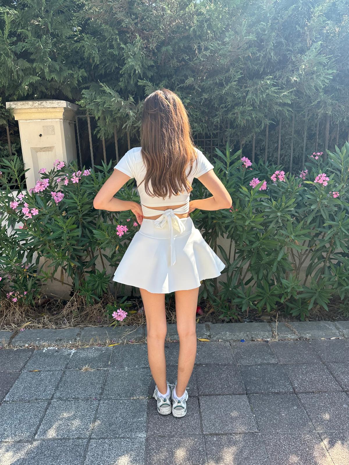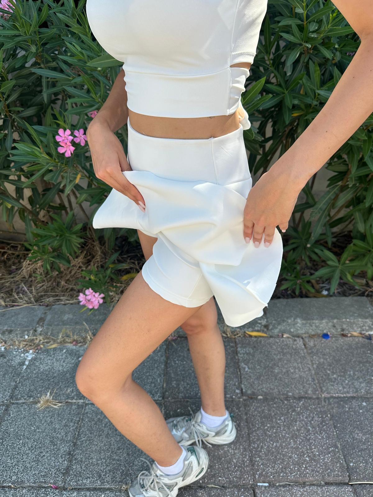 Zarif, Spor ve Fonksiyonel!CherryLane’in yeni sezon şortlu mini eteği, şıklığı ve rahatlığı bir araya getiriyor. Beyaz rengin tazeliği ve scuba kumaşın tok yapısıyla vücudu toparlarken, stiline modern bir hava katıyor.