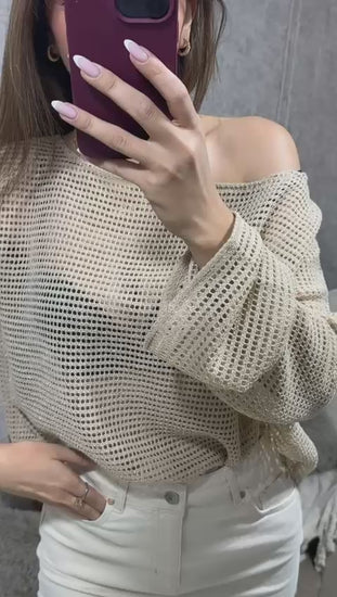 Lurexli Kayık Yaka Ajurlu Desen Bluz