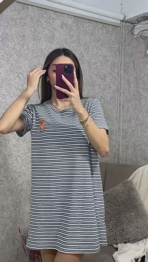 🖤🤍 Siyah Beyaz Çizgili Ayıcık Detaylı T-Shirt Elbise – Eğlenceli ve Rahat Şıklık 🐻